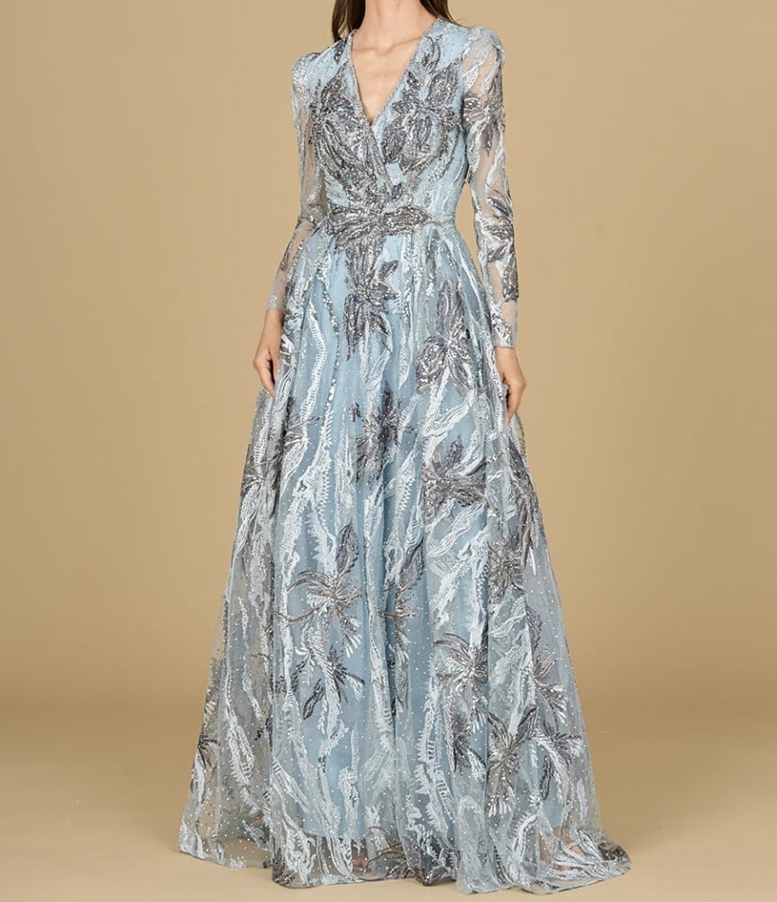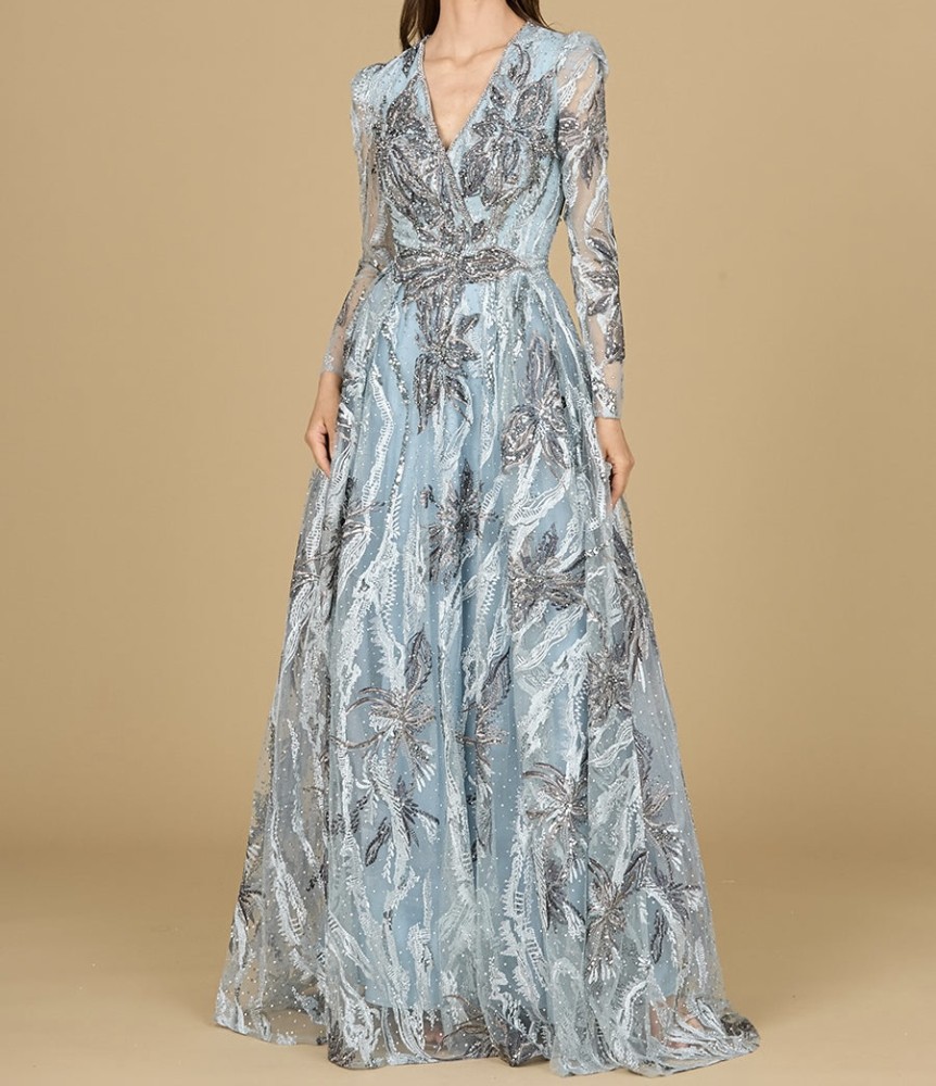 اخطفي الانظار في المناسبات القادمة بفستان لارا المطرز على شكل حرف A وأكمام طويلة ورقبة على شكل حرف V. مطرز بالكامل بتفاصيل وخرز باللون الفضي والمعدني. مثالي لضيفة حفل الزفاف، أو فستان قريبة العروس الأنيقة بنمط مطرز مميز وساحر.