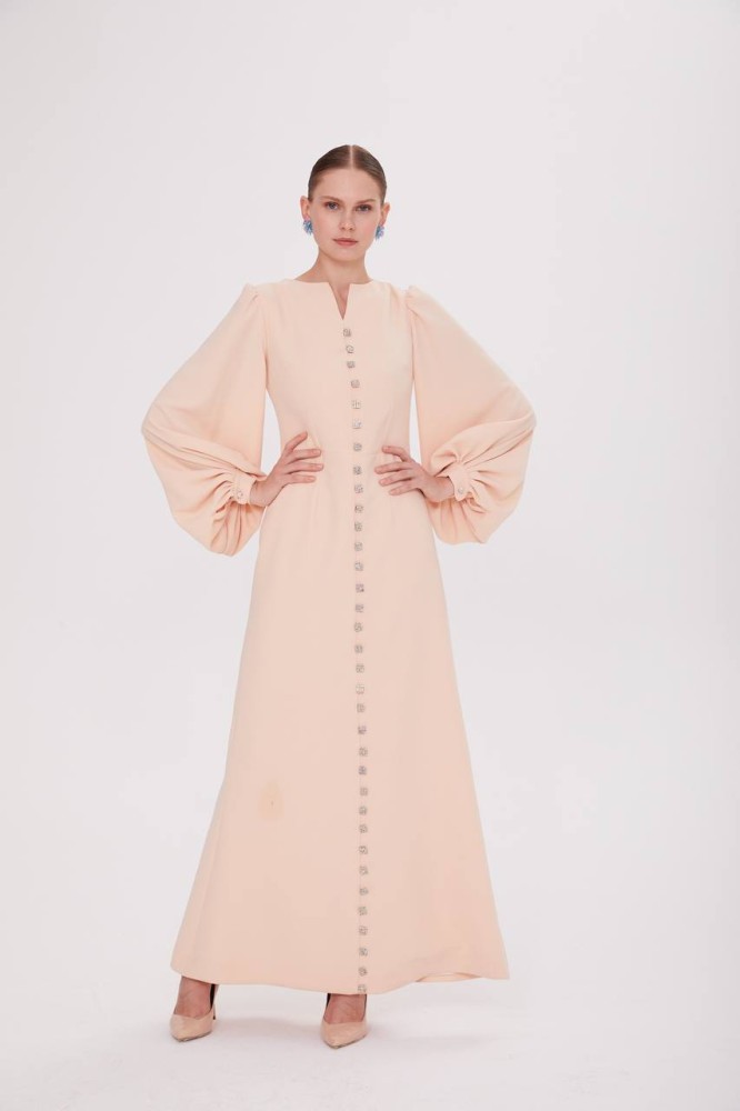 A dress characterized by luxurious touches, made of luxurious crepe material, with a round neckline, wide long sleeves with a ruffled end, decorated with crystal buttons, to give you a distinctive look full of elegance.